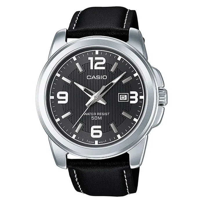 Introducing the Casio® Analogue 'Collection' Men's Watch MTP-1314PL-8AVEF, a sophisticated blend of style and functionality. Crafted for the contemporary man, this timepiece is designed to elevate your everyday look with its modern intricacy and robust features. The watch style is casual, making it an ideal companion for both formal occasions and leisurely outings alike. The round brass case, measuring 43mm in diameter, presents a dignified silver hue that captures attention without being ostentatious. At a thickness of just 10mm, it remains comfortably lightweight on your wrist while exuding a solid presence. Turning to the watch face, the black dial is striking against the silver case, enhanced by mineral glass that offers both clarity and protection against daily wear. The date calendar feature ensures you stay organized, while the AT5 resistance allows this watch to thrive in various environments, making it a reliable choice for any adventure. The high-quality leather band, 21cm in length and 20mm in width, adds a touch of elegance and complements the overall aesthetic, fastened securely with a traditional buckle clasp. Weighing in at 68 grams, you will hardly notice it on your wrist, making it the perfect everyday accessory for the man looking for dependable style. Beneath the surface, the watch operates with quartz movement, guaranteeing precise timekeeping. With a water resistance of up to 5 bars, it is designed to withstand the rigors of daily life, providing peace of mind. The Casio brand has a longstanding reputation for excellence and innovation, making this a watch not to be overlooked by the discerning gentleman. A true testament to quality craftsmanship, the Casio® Analogue 'Collection' Men's Watch MTP-1314PL-8AVEF is more than just a timepiece—it's a statement of style.Shop Casio MTP-1314PL-8AVEF at Ormoda