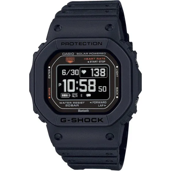 The Casio Digital 'G-shock' Men's Watch DW-H5600-1ER is the epitome of strength and sophistication, perfect for the modern man who values durability without sacrificing style. Crafted with a rectangular resin case, this timepiece measures 44mm in length and 36mm in width, providing a robust yet comfortable fit on your wrist. The watch is encased in a sleek black, designed to withstand the rigors of daily life. Equipped with a mineral glass dial window, it ensures clarity and resistance to scratches, while the vibrant digital display guarantees effortless readability, even in low light conditions. This watch isn’t just about looks; it’s powered by advanced quartz movement for accuracy you can depend on, making it an essential accessory for both adventure and everyday tasks. The features of this G-shock model are extensive, tailored for those who lead an active lifestyle. With a water resistance of up to 20 bars, it can easily handle swimming and snorkeling without the worry of water damage. The additional functionalities such as Bluetooth connectivity, solar power, heart rate monitor, stopwatch, and light mode enhance its practicality, making it more than just a watch but a reliable companion in various scenarios. The lightweight design at only 68 grams ensures that it won't weigh you down, while a 21cm long black plastic band, with a width of 24mm, offers a comfortable, secure fit on the wrist. The buckle clasp ensures easy adjustments, making it suitable for any occasion, sporty or casual.  Whether you’re hitting the gym, diving into the ocean, or just enjoying a casual outing, the Casio Digital 'G-shock' Men's Watch DW-H5600-1ER blends functionality with a modern aesthetic, proving that your wristwear can be both practical and luxurious. Shop Casio DW-H5600-1ER at Ormoda