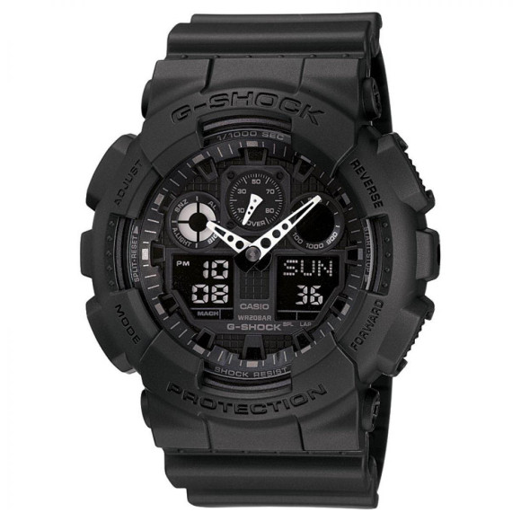 The Casio® Analogue-digital 'G-shock' Men's Watch GA-100-1A1ER is more than just a timepiece; it embodies resilience and precision in a stylish military design. Crafted for the modern man, this watch merges advanced technology with rugged aesthetics. The black resin case, measuring a robust 50mm in diameter and 14mm in thickness, ensures durability while providing a comfortable fit. Built to withstand the rigors of adventurous activities, its 20-bar water resistance makes it a reliable companion for diving, swimming, or any outdoor escapade. The striking black dial offers both analogue and digital displays, presenting a harmonious blend of classic design and contemporary functionality. Beneath the mineral glass dial window, you will find essential features including world time, a stopwatch, countdown timer, and alarm—all designed to keep your day organized. The day-date-month calendar further enhances its practicality, ensuring you stay informed without a hitch. Complemented by a sturdy 21cm black plastic band, the watch is lightweight at just 70 grams, allowing for all-day wear without discomfort. The band width of 22mm provides a secure fit, while the traditional buckle clasp facilitates easy adjustments. The Casio G-shock is not just a timekeeper; it’s an instrument engineered for performance and reliability in even the toughest of conditions, making it the perfect choice for men who lead an active lifestyle.Shop Casio GA-100-1A1ER at Ormoda
