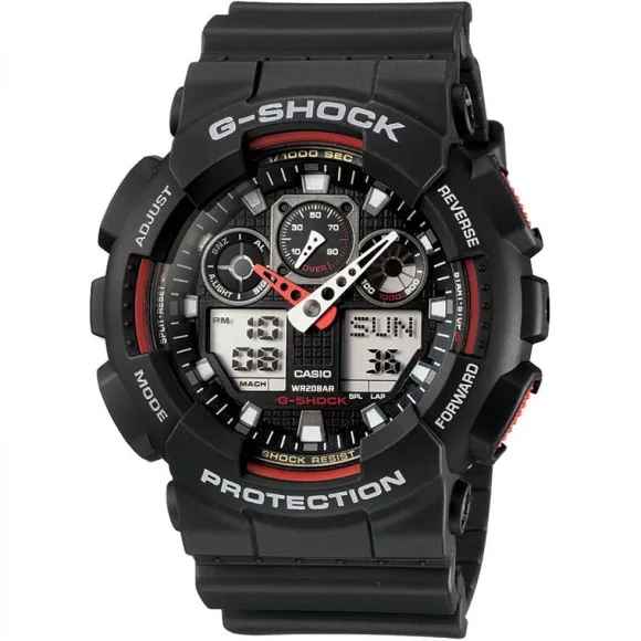 Meet the Casio Analogue-digital 'G-shock' Men's Watch GA-100-1A4ER, a robust masterpiece designed for the modern man who values durability and style. This military-inspired timepiece combines functionality with a tough aesthetic, making it the perfect companion for any adventure. Its striking black resin case, measuring 51mm in diameter and 14mm thick, exudes a bold presence on the wrist. With a water resistance of up to 20 bars, this watch is engineered to withstand the elements, allowing you to explore without fear. The analogue-digital display is effortlessly easy to read, featuring a sleek black dial protected by resilient mineral glass. Adding to its allure, the watch includes a comprehensive calendar that shows the day, date, and month, all while presenting a unique G-SHOCK look that stands out in any setting. The comfortable yet rugged plastic strap, with a length of 21cm and a width of 22mm, provides a secure fit with a reliable buckle clasp. Functional features such as world time, stopwatch, countdown timer, and alarm make this timepiece a multi-functional tool for everyday wear or extreme sports. Whether you’re heading into the wilderness or navigating city streets, the Casio Analogue-digital 'G-shock' watch blends utility with style effortlessly.Shop Casio GA-100-1A4ER at Ormoda