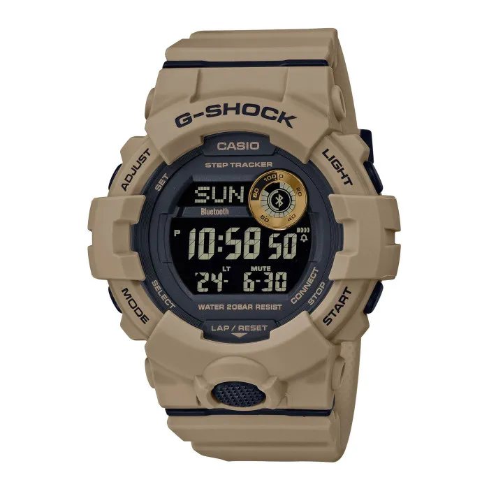 The Casio® Digital 'G-shock' Men's Watch GBD-800UC-5ER is a remarkable piece designed specifically for those who appreciate functionality combined with rugged aesthetics. This military-style watch not only withstands the test of time but also embraces advanced technology, boasting features such as Bluetooth connectivity that keeps you in sync with your devices, alongside essential tools like a stopwatch, timer, and alarm functionality. The digital display makes timekeeping effortless in any situation, allowing you to focus on what truly matters. Featuring a robust round case crafted from durable resin, this watch is built to endure the rigors of outdoor activities while maintaining comfort on the wrist. Measuring 49mm in diameter and 13mm thick, it wears confidently without compromising on style. The striking black dial contrasts beautifully with the brown resin case, ensuring visibility in various environments. Designed with practicality in mind, it comes with a day-date-month calendar feature that keeps you organized, making it a reliable companion for your daily adventures. The watch's band, also made from high-quality plastic, extends to a length of 21cm and is 18mm wide, secured with a sturdy buckle clasp that allows for easy adjustments. Water resistant to an impressive depth of 20 bars, this timepiece is ready for action, whether swimming, hiking, or in the office. Weighing just 62 grams, it offers a lightweight feel, making it perfect for those long days when comfort is paramount. The Casio G-shock is more than a watch; it's a statement of resilience and innovation, tailored for today’s active man. Shop Casio GBD-800UC-5ER at Ormoda