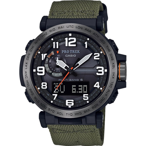 The Casio® Analogue-digital 'Pro-trek' Men's Watch PRW-6600YB-3ER is a quintessential companion for the modern man who values precision and adventure. This timepiece is crafted for those who conquer the great outdoors, embodying the essence of durability and functionality. Designed with a tough black stainless steel case, the watch measures a robust 45mm in diameter, allowing it to stand out without overwhelming the wrist. Its round casing is complemented by a sleek mineral glass window that adds both strength and clarity. The watch effortlessly blends analog and digital displays, offering versatility for those on the go. The striking black dial features a clear layout, where the day-date calendar function ensures you stay organized, whether in the midst of a trek or in your day-to-day activities. The timepiece is not just about looks—it's powered by solar technology, enhancing its sustainability while providing reliability. The watch also boasts a rich array of features for the adventurer, including an altimeter, compass, and thermometer, ensuring you're always prepared for the journey ahead. The durable navy green nylon band gives this watch a military flair, reinforcing its rugged personality while ensuring comfort with its 21cm length and 24mm width. Secured with a reliable buckle clasp, it adapts to fit seamlessly on any wrist, whether you're scaling a mountain or heading to a casual outing. With a water resistance of up to 10 bars, the Casio Pro-trek withstands splashes and brief immersions, making it ideal for outdoor enthusiasts. This watch is an ideal blend of style and robustness, perfectly catering to men who appreciate luxury with an adventurous spirit. Designed to make a statement, it not only complements your wardrobe but also enhances your lifestyle. Every aspect of the Casio Pro-trek reflects excellence, precision, and a commitment to quality that speaks to the modern man.Shop Casio PRW-6600YB-3ER at Ormoda