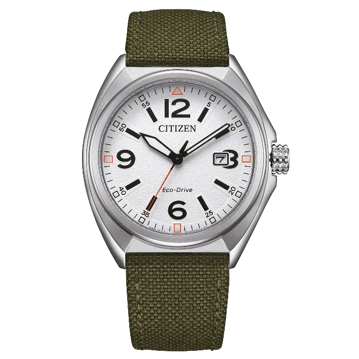 Introducing the Citizen® Analogue Men's Watch AW1571-09A, a marvel of precision and aesthetics crafted for the contemporary man. At the heart of this timepiece lies Citizen's renowned Eco-Drive movement, an innovative technology that harnesses light from any source to power the watch, ensuring you are never tied to battery replacements. This thoughtfully designed watch boasts a sleek silver stainless steel case, which exhibits a refined round style, with a case diameter of 40mm that suits various wrist sizes with comfortable wear. The case thickness of just 10mm and a lug-to-lug height of 47mm contribute to a sophisticated profile while maintaining a rugged quality suited for everyday adventures. The striking white dial is protected by crystal glass, which not only enhances visibility but also adds an element of durability against the rigors of daily life. The use of a green nylon band introduces a modern twist, blending seamlessly with the silver case and providing a fresh, vibrant look. The band length of 21 cm and width of 21 mm ensures a secure fit, while the buckle clasp type adds convenience to your daily routine. Featuring a handy date calendar, this watch keeps you organized as you navigate your busy schedule. With a water resistance of 10 bars, the Citizen® Analogue Men's Watch is a reliable companion for those who value both style and functionality in their accessories.