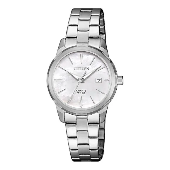 Introducing the Citizen® Analogue Women's Watch EU6070-51D, a stunning accessory that beautifully marries elegance with everyday practicality. Crafted for the modern woman, this watch features a round case made from premium stainless steel, finished in a lustrous silver hue that exudes sophistication. The 28mm diameter ensures a comfortable fit on any wrist, while the slim 7mm thickness adds to its delicate charm. With a striking mother of pearl dial, each glance reveals an iridescent play of colors, making it a truly mesmerizing focal point for your ensemble. The mineral glass window protects the dial from scratches, ensuring that your timepiece remains pristine no matter where life takes you. The Citizen watch offers a reliable quartz movement, so you can count on it to keep you on schedule. Functionally designed, the watch comes with a convenient date calendar, beautifully integrated into the design. It is water-resistant up to 5 bars, giving you peace of mind whether you're at a casual brunch or enjoying a dip in the pool. The silver-toned band, also crafted from stainless steel, measures 19 cm in length and 13 mm in width, providing both strength and elegance. The fold-over clasp with a push button ensures a secure fit, while still being easy to wear. This watch is perfect for any casual occasion, gracefully complementing your wardrobe while providing the reliability you need in everyday wear. Shop Citizen EU6070-51D at Ormoda