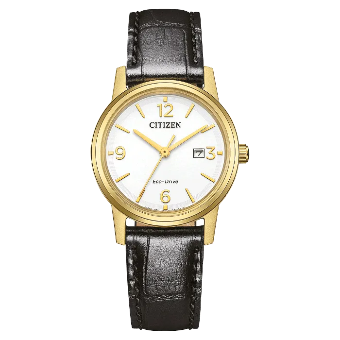 Introducing the Citizen® Analogue Women's Watch, an exquisite piece that perfectly embodies sophistication with its elegant design. Crafted with a gleaming gold stainless steel case measuring 30mm in diameter, this watch exudes a sense of luxury. Its round style, with a delightful case thickness of just 7mm, offers a delicate silhouette that complements any wrist size effortlessly. The clean white dial, protected by durable crystal glass, features a date calendar for added functionality, seamlessly blending practicality with elegance. With the Eco-Drive movement, you can say goodbye to battery changes, as this innovative technology is powered by light, ensuring you can enjoy your timepiece without interruptions. The watch is adorned with a striking black leather band that measures 19cm in length and 15mm in width, providing comfort while maintaining a chic appearance. The buckle clasp ensures a secure fit, making it suitable for both daily wear and special occasions. This timepiece not only makes a statement but also offers a 3-bar water resistance, ensuring it withstands splashes and light rain with ease. Weighing only 27 grams, this watch is as light as it is beautiful, making it a perfect addition to any jewelry collection. Let the Citizen® Analogue Women's Watch be your companion, enhancing your style while keeping you punctual and poised. Shop Citizen EW2722-01A at Ormoda