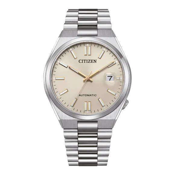 Introducing the Citizen® Analogue 'Tsuyosa' Men's Watch NJ0151-88W, a masterful blend of craftsmanship and style that is sure to elevate any man's collection. Hailing from a brand renowned for its innovative technology and elegant designs, this timepiece exemplifies luxury with a touch of sophistication. The 'Tsuyosa' model reflects Citizen's commitment to quality and precision, offering an automatic movement that keeps time with exceptional accuracy. The watch is not just a tool for telling time; it is a statement of style and grace, making it ideal for both formal occasions and everyday wear. Crafted with a stunning beige dial encased in durable sapphire glass, the watch's aesthetic is enhanced by its silver stainless steel construction, ensuring it catches the light beautifully, revealing its inherent elegance. With a 40mm round case and a thickness of just 12mm, the 'Tsuyosa' fits comfortably on the wrist while maintaining a bold presence. It features a fold-over clasp with push button for added security, and its 21cm length makes it suitable for a range of wrist sizes. Not only does it provide a date function to keep you organized, but it is also water-resistant up to 5 bars, making it as practical as it is stylish. Measuring 45mm lug to lug, this watch is a true representation of Citizen's dedication to craftsmanship and functionality, making it a worthy companion for the discerning gentleman. Shop Citizen NJ0151-88W at Ormoda