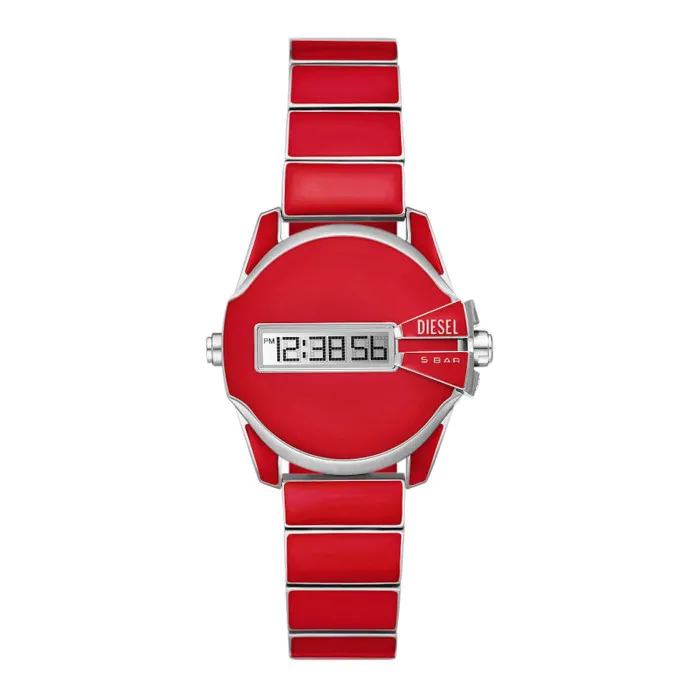 The Diesel® Digital 'Baby Chief' Men's Watch DZ2192 is more than just a timepiece; it's a statement of individuality and style. Designed for the modern man who values both functionality and aesthetics, this watch combines a vibrant red color scheme with quality craftsmanship. The round stainless steel case, measuring 32mm in diameter and 9mm thick, houses a bold red dial that features a digital display, perfect for those who appreciate innovative design. Underneath the mineral glass window, the day-date calendar function enhances practicality in daily use. The watch securely fits on your wrist thanks to the robust stainless steel band, extending up to 21cm in length and 18mm in width. Its fold-over clasp with a push-button ensures both comfort and security, making it ideal for everyday wear. With a water resistance capability of up to 5 bars, this watch stands up to the rigors of daily life without compromising on style. The unique multicoloured styling of the case adds an edgy twist, allowing you to express your personality. Weighing just 102 grams, it is lightweight and comfortable for all-day wear. This casual watch artfully combines sportiness with chic elegance, making it versatile for various occasions, whether you are at work or enjoying a night out. The Diesel Baby Chief is the perfect accessory for the man who dares to be different. Experience the perfect fusion of form and function with Diesel, where every detail is crafted to meet and exceed your expectations.