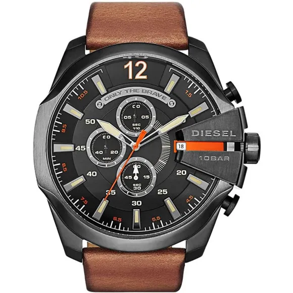 Introducing the Diesel® Chronograph 'Mega Chief' Men's Watch DZ4343, a masterclass in engineering and design. This black timepiece stands out with a case diameter of 51mm, making it an impressive accessory for any man. Crafted from durable stainless steel, it features a robust round case that ensures longevity while exuding an aura of strength. The watch thickness of 14mm gives it a substantial presence on the wrist, while the sleek black dial, protected by mineral glass, offers a striking counterpoint to the sturdy case. You'll appreciate the thoughtfully designed chronograph display that not only helps you keep track of time but also adds a sporty edge to your outfit. The brown leather band complements the overall aesthetic beautifully. With a width of 26mm and a length of 21cm, it ensures comfort without sacrificing style. The buckle clasp guarantees a secure fit, making this watch ideal for both daily wear and special occasions. Water-resistant up to 10 bars, it is made to withstand splashes and can handle life’s little adventures with ease. The date calendar feature adds practicality for everyday use, while the impressive weight of 138 grams feels substantial but not cumbersome. With the Diesel Mega Chief on your wrist, you embody a blend of sophistication and ruggedness that sets you apart. This watch is not just a timepiece; it is a statement of style and confidence, designed for the modern man who appreciates quality and attention to detail. Enjoy the fusion of technology and artisan craftsmanship with Diesel, where every watch is crafted to make a mark.
