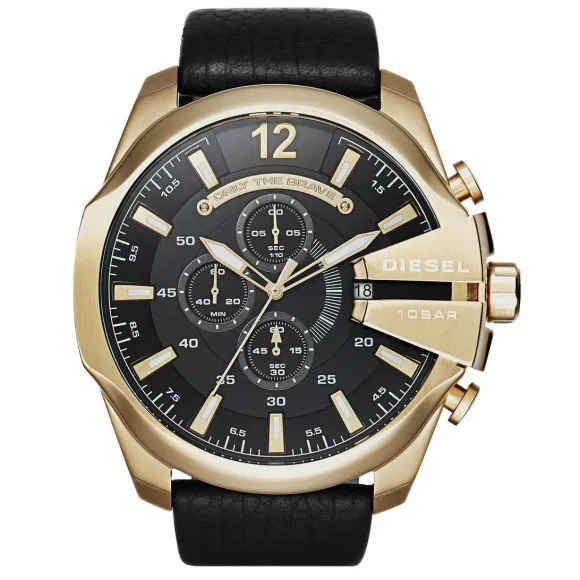 Experience the fusion of style and functionality with the Diesel Chronograph 'Mega Chief' Men's Watch DZ4344. Crafted for the modern man, this timepiece embodies the bold aesthetics Diesel is renowned for. The watch features a striking round case made from durable stainless steel, tinted in an eye-catching gold color that radiates sophistication. Measuring a substantial 51mm in diameter with a thickness of 14mm, it makes a commanding statement on the wrist. The black dial serves as the centerpiece of this watch, accentuated by luminous hour markers and hands, ensuring you can tell time at a glance even in low light. Its chronograph display adds a sporty twist, allowing for precision timing, while the date function enhances practicality, making it the ideal companion for both work and leisure. Protected by a tough mineral glass window, the dial remains resistant to scratches and maintains clarity for years to come. The watch is paired with a robust black leather band, measuring 21cm in length and 26mm in width, providing both comfort and style. The buckle clasp ensures a secure fit while adding to the overall masculine aesthetics. Designed to withstand water pressure up to 10 bars, this watch is perfect for the active man who enjoys life without limits. Weighing just 135 grams, it offers a comfortable yet substantial presence on the wrist, making it a versatile addition to any collection. Elevate your watch game with the Diesel Mega Chief, where craftsmanship meets bold design.Shop Diesel DZ4344 at Ormoda