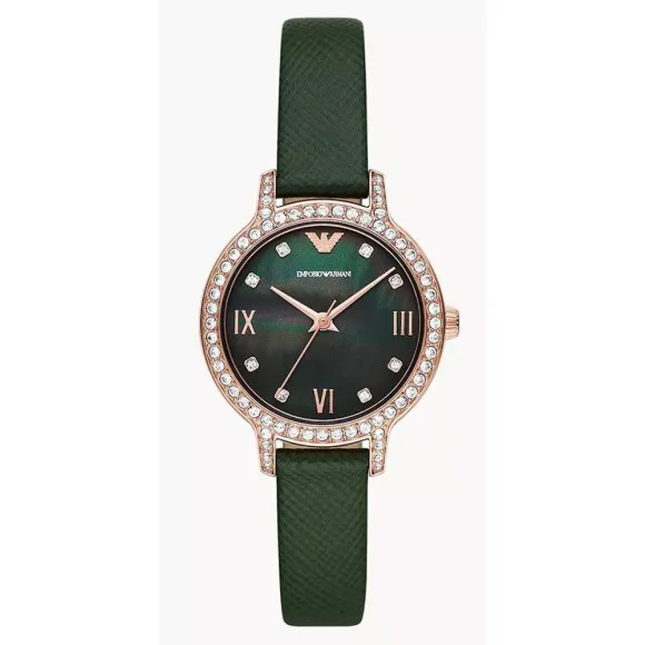 Introducing the Emporio Armani® Analogue 'Cleo' Women's Watch AR11577, a stunning timepiece that embodies the essence of elegance and sophistication. This exquisite watch is crafted with meticulous attention to detail, perfect for the modern woman who appreciates both style and functionality. The rose gold case offers a luxurious touch, complemented beautifully by the vibrant green dial and band. Every element of this watch has been carefully chosen to create a harmonious blend of design and practicality. The round case, with a diameter of 32mm and a thickness of just 7mm, rests comfortably on the wrist, while the stainless steel construction ensures durability. Featuring a quartz movement, this watch guarantees accurate timekeeping, making it an ideal accessory for daily wear or special occasions. The stone settings along the bezel add a touch of glamour, turning a simple watch into a statement piece. With a water resistance of up to 5 bars, the Cleo watch is versatile enough to accompany you on all of life’s adventures, be it a day at the office or a night out. The leather band has a length of 19cm and a width of 12mm, providing both comfort and style. It fastens securely with a classic buckle, ensuring that it will stay in place throughout your day. The lush green color of the band harmonizes beautifully with the green dial, creating a refreshing and modern look. Whether it's a gift for someone special or a treat for yourself, the Emporio Armani® Analogue 'Cleo' Women's Watch AR11577 is sure to impress. Shop Emporio Armani AR11577 at Ormoda