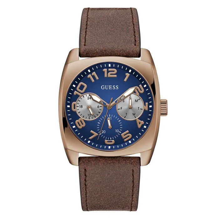 Introducing the Guess® Multi Dial 'Xander' Men's Watch GW0792G4, a true embodiment of sophistication and functionality designed for the modern man. This exquisite watch fuses style with practicality, offering a stunning rectangular case crafted from robust stainless steel. Its brown case not only exudes an air of elegance but is also complemented by a durable leather strap that showcases craftsmanship and comfort, perfect for daily wear or special occasions. The captivating blue dial adds a captivating contrast, featuring a multi-dial display that ensures you stay organized and punctual, all while radiating a polished professional look. The precise quartz movement ensures accurate timekeeping, while the day-date function provides added convenience. With a case thickness of just 10mm and a length of 41mm, this watch maintains a sleek profile without compromising on visibility. You can confidently venture into wet conditions with a water resistance of up to 5 bars, making it suitable for light water activities. Additionally, the mineral glass dial window provides enhanced durability against scratches, ensuring your watch remains pristine over time. The watch’s total weight of 70 grams feels just right on the wrist, balancing sturdiness with comfort, and is sure to make a statement wherever you go. The adjustable leather band, measuring 21cm in length and 24mm in width, guarantees a perfect fit for varied wrist sizes. You can effortlessly fasten it with a secure buckle clasp that adds both style and functionality. The Guess® Multi Dial 'Xander' is not just a timepiece; it's a lifestyle accessory designed with the modern man in mind, making it the perfect addition to any watch collection.