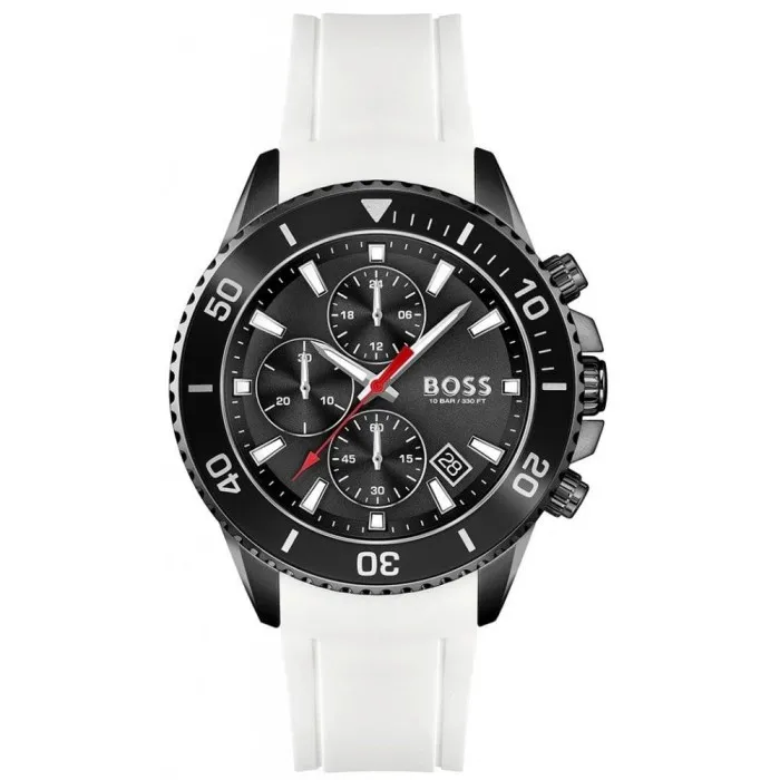 The Hugo Boss® Chronograph 'Admiral' Men's Watch 1513966 stands out in the world of luxury timepieces. Designed for the modern gentleman, this diver's watch combines functionality with elegance, making it a perfect choice for both adventurous outings and stylish gatherings. The watch features a robust 45mm black stainless steel case, infused with a masculine edge, enhancing its durability while maintaining a sleek appearance. This timepiece is not just about looks; it boasts a quartz movement, ensuring precision in every tick. The striking black dial is complemented by luminous hands and numbers, allowing you to read the time effortlessly even in low light conditions. With a water resistance rating of up to 10 bars, the Admiral is tailored for the active man who loves to explore the depths of the ocean or simply enjoy a day at the pool. The chronograph feature, coupled with a stopwatch function, offers added versatility for the sports enthusiast, making it an indispensable companion during workouts or adventures. The watch is encased in durable mineral glass, providing an additional layer of protection against scratches. A white silicone band adds a contemporary touch while ensuring comfort around the wrist. With a generous length of 21cm, it fits perfectly on most wrists, combining style and practicality. Completing the design is a reliable buckle clasp, ensuring security while exuding sophisticated charm. Embrace the spirit of adventure with this quintessential luxury piece that reflects the boldness and style of the Hugo Boss brand.