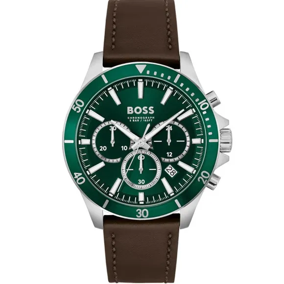 The Hugo Boss® Chronograph 'Troper' Men's Watch 1514098 is a remarkable addition for those who appreciate both functionality and style. With its sporty edge, this watch is tailored for the modern man who values performance in his accessories. The timepiece features a striking green dial complemented by luminous hands and numbers, ensuring visibility at all hours. Crafted from stainless steel, the round case exudes durability and elegance, measuring 44mm in diameter and 11mm in thickness. The bezel proudly displays numbers, adding a unique touch to its design, while the mineral glass window enhances its allure and protects against everyday wear and tear. The watch is powered by a reliable quartz movement, ensuring accuracy in every tick. It offers a chronograph display, allowing for precise timing with a stopwatch feature. Additionally, a convenient date calendar is seamlessly incorporated, providing practicality to your busy life. The brown leather band, measuring 21cm in length and 21mm in width, adds a classic flair and is secured by a sturdy buckle clasp, ensuring a comfortable fit. With a water resistance rating of 5 bars, the Troper is prepared for any adventure, making it a versatile companion for both sports and casual wear.
