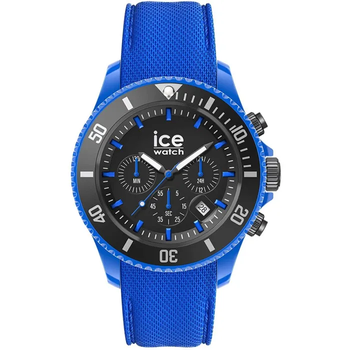 Step into the vibrant world of Ice Watch with the Ice Watch® Chronograph 'Ice Chrono - Neon' Men's Watch, model 019840. This timepiece is an emblem of sporty elegance, designed for men who appreciate both function and style. The watch features a striking blue resin case, measuring 44mm in diameter and 13mm thick, designed to withstand the rigors of an active lifestyle. The round case houses a bold black dial protected by durable mineral glass, ensuring clarity and resilience. This chronograph watch doesn’t just keep time; it elevates your daily wear with its sporty chic aesthetic. Equipped with a turnable bezel, the Ice Chrono is perfect for those who appreciate the blend of practicality and style. The watch is powered by a reliable quartz movement, providing precise timing you can count on. Its beautiful blue silicone band fits comfortably with a length of 21cm and width of 21mm, secured by a practical buckle clasp. The watch is designed with a date calendar function and has a water resistance of up to 10 bars, making it suitable for diving and adventurous outings. The Ice Chrono stands as a testament to innovative watchmaking, embodying a fusion of sporty design and advanced technology. Weighing just 66 grams, it feels lightweight yet sturdy on the wrist. Measuring 52mm from lug to lug height, this timepiece ensures a perfect fit for larger wrists. Whether you are hitting the gym or heading out for a casual dinner, this watch is a versatile choice that embodies a modern lifestyle, making it an essential accessory for any man.