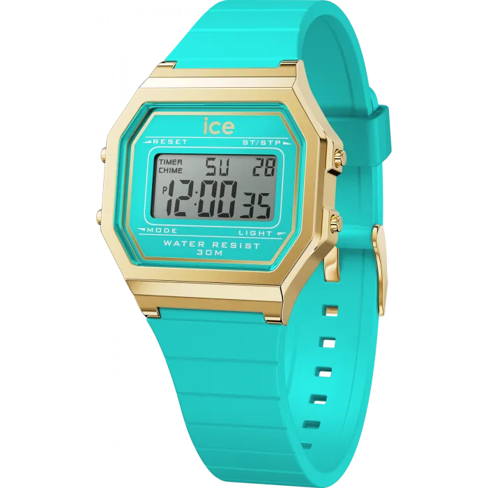 The Ice Watch® Digital 'Ice Digit Retro - Blue Curacao' Women's Watch 022055 is a delightful expression of style and practicality. Crafted with a striking blue dial and a chic gold resin case, this casual watch perfectly embodies the spirit of contemporary elegance. With a case length of 34mm and a width of 32mm, it fits beautifully on the wrist, providing a comfortable wear for all-day use. The watch features a mineral glass window that ensures durability while allowing the display to shine. The mesmerizing digital display offers multiple functionalities, including a day-date calendar, stopwatch, dual time, and alarm, making it a valuable companion in the bustling lives of modern women. The blue silicone band, measuring 19cm in length and 18mm in width, complements the overall design, adding a touch of fun and flexibility. Weighing only 26 grams, this timepiece is not just light but incredibly stylish. With a water resistance of up to 3 bars, you can wear it with confidence in various settings, from casual outings to sporty adventures. Illuminate your moments with the perfect blend of elegance and innovation that the Ice Digit Retro offers, ready to make your daily experiences unforgettable.