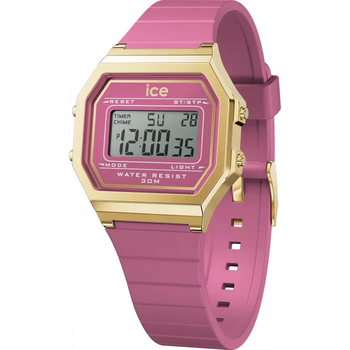 Create a delightful splash of color on your wrist with the Ice Watch® Digital 'Ice Digit Retro - Blush Violet' Women's Watch 022051. This trendy timepiece showcases a rejuvenating blush violet hue that radiates warmth and charm, perfect for the modern woman who embraces a casual yet distinctive style. The rectangular resin case, in a striking gold tone, measures 34mm in length and 32mm in width, making it a fashionable accessory that seamlessly blends in with your everyday wear. With a thin profile of only 8mm, it offers a comfortable fit without compromising on elegance. The pink dial is paired beautifully with mineral glass, ensuring that your watch remains scratch-free while providing you with a clear view of time. The digital display is incredibly practical and features multiple functionalities including a stopwatch, dual time, alarm, and light, catering to a variety of needs throughout your day. The watch band, made of soft silicone, comfortably fits wrists up to 19cm and features an 18mm width for a snug and secure fit. With a water resistance rating of 3 bars, this watch will accompany you through light rain or splashes, making it an excellent choice for the active woman. The buckle clasp ensures easy wearability, while the day-date calendar function keeps you on track with your schedule. The Ice Digit Retro is not just a watch; it's a statement piece that balances functionality with elegant design.