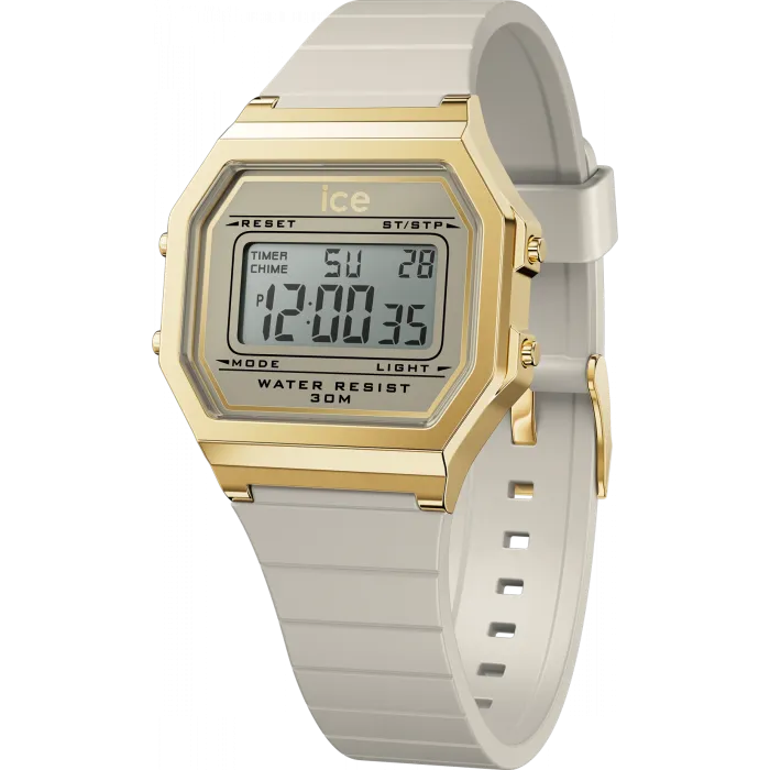 Step into a world of playful elegance with the Ice Watch® Digital 'Ice Digit Retro - Wind' Women's Watch. This casual timepiece, designed for modern women, captures the essence of retro style while incorporating essential functionality. Measuring 34mm in length and width, this square-shaped watch boasts a chic gold-resin case complemented by a sophisticated grey dial, reflecting a sense of refined glamour. The lightweight structure, weighing just 25 grams, ensures a comfortable fit for daily wear. The durable mineral glass protects the display, while the silicone band provides extra flexibility and comfort, making it a must-have accessory for all occasions. Functionality is at the forefront of this stunning watch, featuring a digital display that seamlessly integrates with a range of utilities. You can effortlessly manage your day with the day-date calendar, a stopwatch for precise timing, dual time settings perfect for travel, and even an alarm to keep you on track. The included light feature adds practicality for those moments when you need to catch the time in low-light conditions. With a water resistance of up to 3 bars, it is designed to withstand the rigors of everyday life. With a band length of 19cm and a width of 17mm, it is thoughtfully designed to suit every wrist size. Whether you're dressing up for a night out or keeping it casual during the day, this watch adapts to your style. The Ice Watch® Digital 'Ice Digit Retro - Wind' is more than just a timekeeper; it’s a statement piece reflecting your unique personality. Elevate your accessory game with a timepiece that perfectly balances style and function, making it an ideal addition to your jewelry collection.