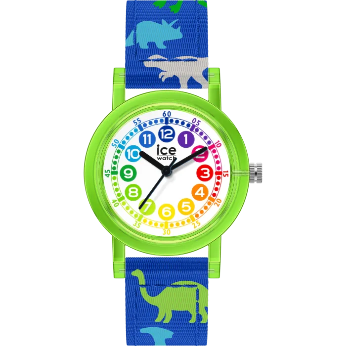 Step into the world of fun and adventure with the Ice Watch® Analogue 'Ice Learning - Green Dinosaur' Boys's Watch 022693. Designed especially for young explorers, this timepiece embodies the spirit of childhood curiosity with its vibrant colors and playful dinosaur theme. The round watch case, with a diameter of 32mm and a thickness of 10mm, is made of durable green resin, ensuring that it can withstand the rigors of daily play. Perfectly sized for young wrists, the watch features a blue fabric band that is comfortable and lightweight, measuring 19cm in length and 15mm in width. It's an ideal accessory for boys who love to express themselves while keeping an eye on time. The white dial is protected by mineral glass, making it resistant to scratches, a useful feature for active kids. With a stylish analogue display, this watch is not just a timekeeper but a statement piece that adds character to any outfit. It also boasts a water resistance of up to 3 bars, providing peace of mind against splashes and spills during everyday adventures. The buckle clasp keeps it secure on the wrist, making it as practical as it is fun. This watch is part of a special collection aimed at encouraging children to learn about telling time while embracing their love for unique styles.