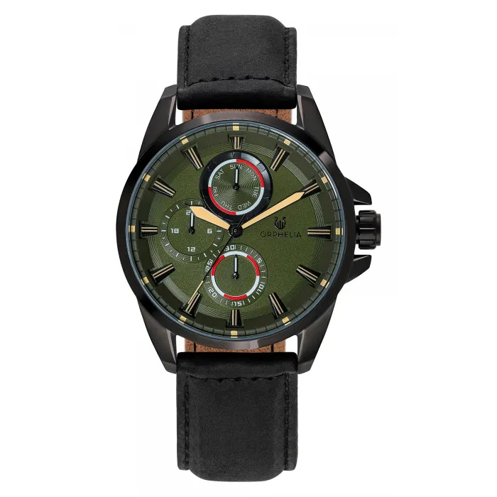 Introducing the Orphelia® Multi Dial 'Eddington' Men's Watch OR71901, a remarkable blend of sophistication and ruggedness designed for the modern man. With a solid round case crafted from durable stainless steel, this watch flaunts a striking black color that complements its robust appeal. Measuring 44mm in diameter and 12mm in thickness, the case is both substantial and comfortable on the wrist, ensuring it makes a statement without sacrificing wearability. The green dial is not only visually appealing but also functional, featuring a multi-dial display that provides essential timekeeping features at a glance. Encased in resilient mineral glass, the dial is protected against scratches and impact, making it perfect for those on-the-go moments. Beyond just looking great, the watch incorporates a day-date calendar function, facilitating easy tracking of daily activities and appointments. Paired with a stylish genuine leather band in a classic black color, the watch band not only enhances comfort but also adds an element of elegance. With a length of 22cm and a width of 20mm, this band is designed to fit most wrist sizes with ease. The buckle clasp ensures a secure fit, allowing you to wear the watch with confidence throughout the day. This timepiece boasts a water resistance rating of 3 bars, making it suitable for everyday wear while guarding against splashes and brief immersion. The lightweight design, weighing only 88 grams, ensures that it feels as good as it looks, solidifying the Eddington as a versatile addition to any man’s accessory collection.