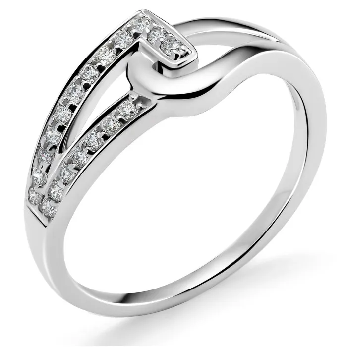 The Orphelia® Women's Whitegold 18C Ring - Silver RD-3222 embodies sophistication and elegance, making it an exquisite addition to any jewelry collection. Crafted from luxurious 18-carat white gold, this ring showcases a harmonious blend of sleek design and brilliant shine. The asymmetrical shape adds a modern twist, creating a captivating visual appeal that turns heads and sparks conversation. This ring is designed specifically for women who appreciate the finer things in life and want to express their unique style with a touch of luxury. Adorned with nineteen brilliant cut diamonds, the ring sparkles with a total diamond weight of 0.17 carats. Each diamond is set carefully in a prong setting to maximize sparkle and brilliance. The diamonds feature a clarity rating of small inclusions (SI1) and are of splendid white color, classified as Wesselton (H). This delicate combination of quality stones creates a stunning visual display that effortlessly catches the light, enhancing the ring's overall allure. The ring's width of 0.7 cm ensures a comfortable fit while maintaining an eye-catching silhouette that complements any outfit, whether casual or formal. Its round gemstone shape corresponds flawlessly with the elegance and refinement found in Orphelia’s design philosophy. Designed for the discerning woman who values both beauty and craftsmanship, this ring stands as a testament to the artistry and dedication inherent in Orphelia's creations. Embrace the sense of wonder that comes with wearing a piece that reflects your unique spirit and sophistication.