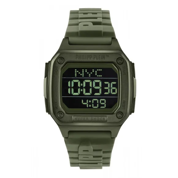 Introducing the Philipp Plein® Digital 'Hyper $hock' Men's Watch PWHAA0421, a remarkable timepiece that blends athletic style with cutting-edge technology. This watch is designed for the modern man who appreciates both functionality and fashion. With a striking rectangular case crafted from stainless steel, its deep green hue adds a bold touch to any outfit. Standing at 44mm in length and 40mm in width, it commands attention while promising durable wear. The 12mm thickness provides a robust frame, made to withstand the rigors of an active lifestyle. The watch features a striking black dial, protected by mineral glass to resist scratches and ensure clarity. Equipped with a digital display, it includes multiple conveniences such as a stopwatch, timer, alarm, and light, making it perfect for sports enthusiasts or anyone who values punctuality in their busy lives. The day-date calendar feature is an added advantage, helping you keep track of your schedule with ease. The Hyper $hock is not only functional but also comfortable. With a 21cm silicone band that gently hugs the wrist, it features a width of 22mm and is secured with a durable buckle. The green band complements the watch case, creating a stylish, cohesive look that is sure to stand out. With an impressive water resistance of 5 bars, this watch is ready for any adventure, whether you’re hitting the gym or enjoying a day by the water. Designed for those who demand excellence, the Hyper $hock truly encapsulates the perfect marriage of sport and sophistication.