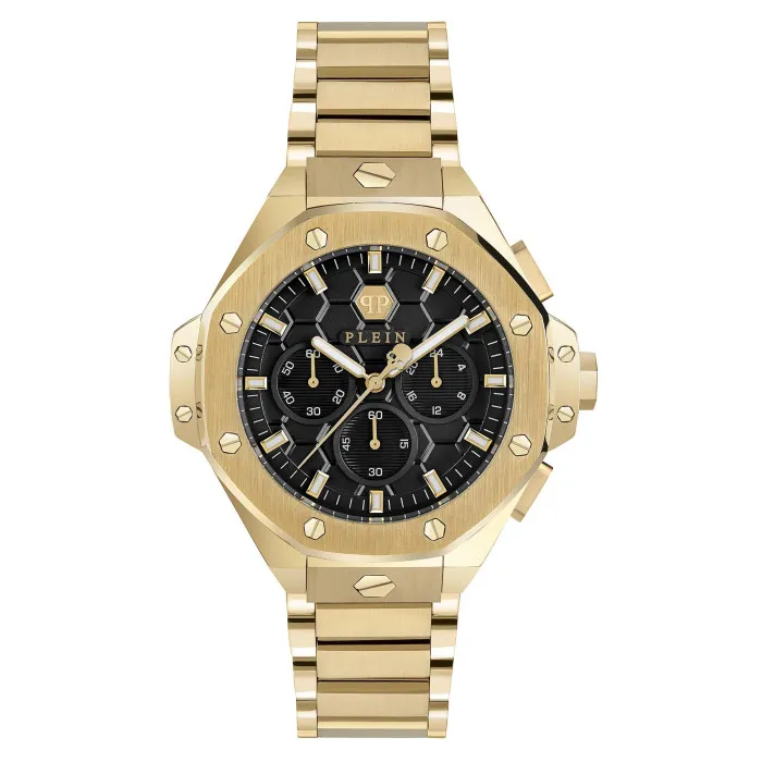 Introducing the Philipp Plein® Chronograph 'Plein Chrono Royal' Unisex's Watch PWPSA0424, a perfect blend of style and functionality that caters to the modern individual. Crafted with a keen eye for fashion, this timepiece is undeniably versatile, making it suitable for both casual and formal occasions. The sleek gold stainless steel case, with a round design, showcases an elegant and timeless aesthetic, complemented by a striking black dial. Measuring 42mm in diameter and 12mm in thickness, the case is both substantial yet comfortable to wear. The mineral glass window protects the intricate details of the dial, while the luminous hands and numbers ensure visibility in any lighting condition. This watch features a reliable quartz movement, known for its precision and low maintenance. It is equipped with a chronograph display, allowing for accurate timing with its stopwatch functionality and 24-hour display feature, making it an ideal companion for sport and regular use alike. The gold stainless steel band, measuring 20cm in length and 16mm in width, adds a luxurious touch, while the deployment clasp guarantees a secure fit. With a water resistance of up to 5 bars, the watch is poised to keep up with your active lifestyle, whether you're at the pool or running daily errands. Designed for anyone who appreciates high fashion and practicality, the Philipp Plein® Chronograph 'Plein Chrono Royal' Unisex's Watch PWPSA0424 makes a bold statement on any wrist. It balances functionality with stylish sophistication expertly, making it a must-have addition to any accessory collection. Shop Philipp Plein PWPSA0424 at Ormoda