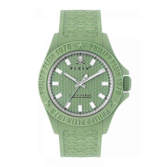 The Philipp Plein® Analogue 'Plein Power' Unisex's Watch PWKAA0221 is a bold statement piece that embodies the essence of modern luxury. With its striking green color palette, this watch is designed for those who appreciate both style and functionality. The casual design makes it suitable for everyday wear, and its versatile appeal ensures it complements a wide range of outfits. Featuring a quartz movement, this watch guarantees precision and reliability. The 43mm round silicone case is not only aesthetically pleasing but also ensures durability, making it ideal for an active lifestyle. Its 13mm thickness adds substantial presence to the wrist, while the mineral glass window protects the dial from scratches and damage. The green dial harmonizes beautifully with the case and band, creating a cohesive look that's both eye-catching and sophisticated. The 20cm green silicone band is comfortable and adjustable, fitting a variety of wrist sizes with ease. With a width of 22mm, it has a sturdy appearance, while the buckle clasp allows for secure fastening. Designed to withstand water pressure up to 5 bars, this timepiece is perfect for those spontaneous adventures, whether at the beach or in the city. The lug-to-lug height of 51mm contributes to an optimal fit, ensuring a comfortable wear throughout the day. With a weight of only 72 grams, it's lightweight enough for all-day wear without compromising style or comfort.