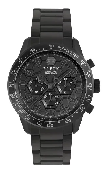 Philipp Plein® Chronograph 'Pleinmeter' Men's Watch PWPYA0624 exudes an air of sophistication and power. Designed for the modern man who appreciates fine craftsmanship, this timepiece combines striking aesthetics with reliable performance. The elegant black stainless-steel case has a diameter of 44mm, presenting a bold statement on your wrist. Its round design is complemented by a sleek 11mm thickness, making it not just a functional accessory, but a striking piece of art. The black dial, fortified with mineral glass, showcases an eye-catching tachymeter function, providing precision for those who appreciate speed and accuracy. The watch features a deployment clasp that ensures a perfect fit for a comfortable wear throughout the day. With a 21cm long black stainless-steel band, the watch melds perfectly with the wrist while adding a luxurious touch. Its design is not only suitable for casual wear but also elevates formal attire, making it an exquisite choice for any occasion. With an impressive water resistance of 5 bars, this watch is built to withstand splashes and brief immersions, adding practicality to its luxurious design. Each element has been carefully considered to ensure that this timepiece embodies the spirit of modern masculinity while providing the functionality expected of a premium chronograph.