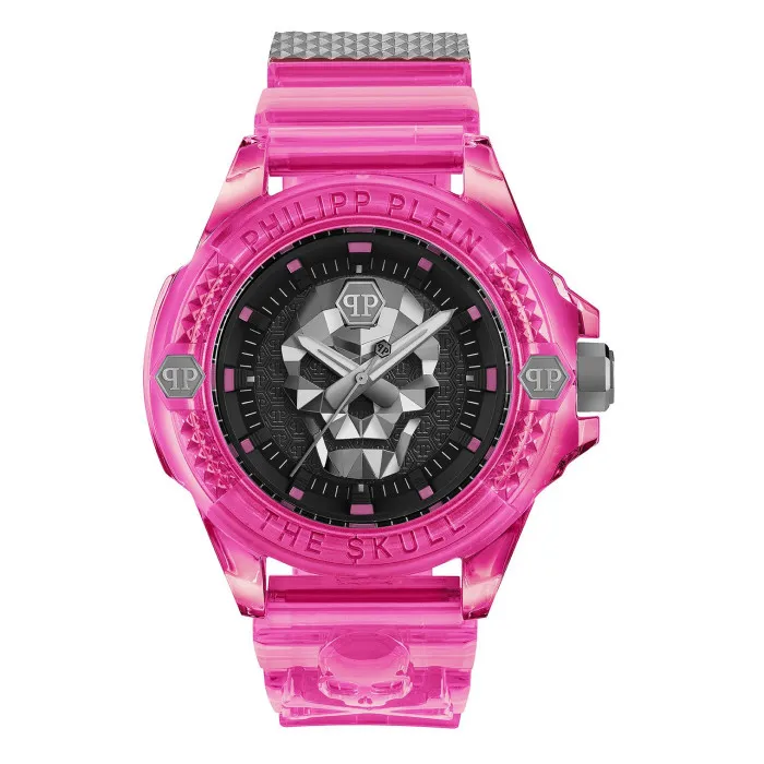 Embrace your unique style with the Philipp Plein® Analogue 'The $kull Scuba Duba Edition' Unisex's Watch PWWAA0624. This striking timepiece is crafted with a bold combination of black and pink elements, making it a perfect accessory for anyone looking to make a statement. The watch features a round case made from durable resin, measuring 44mm in diameter and 14.4mm thick, ensuring both comfort and resilience in your daily activities. Designed for versatility, this casual watch is ideal for various occasions, whether you're out for a casual outing or dressing up for a special event. The black dial showcases a unique design that draws attention, while the mineral glass provides clarity and protection against daily wear and tear. The watch is powered by a reliable quartz movement, ensuring accurate timekeeping at all times. With a water resistance of up to 5 bars, you can dive into adventures without worry. The vibrant pink plastic band is not only stylish but also lightweight, measuring 20cm in length and 22mm in width, making it suitable for everyday wear. The buckle clasp ensures a secure fit, allowing you to enjoy your activities with peace of mind. This versatile piece combines fashion with functionality, making it a must-have in your collection.