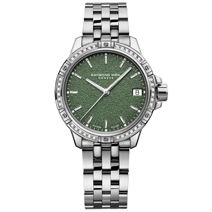 The Raymond Weil® Analogue 'Tango' Women's Watch 5960-STS-52061 is a stunning embodiment of elegance and sophistication. Crafted meticulously for the modern woman, this beautiful timepiece features a lustrous round stainless steel case, measuring 30mm in diameter and only 7mm thick, showcasing a graceful silhouette perfect for any occasion. Its enchanting green dial, protected by sapphire glass, adds a refreshing touch, making it a unique accessory that stands out in a crowd. The delicate stone settings on the bezel enhance its luxe appeal while capturing the essence of refined femininity. Designed to ensure every detail is attended to, this watch features a reliable quartz movement for precision that you can count on. A date calendar function allows you to stay organized while maintaining your stylish edge. The stunning stainless steel bracelet, measuring 19cm in length and 14mm in width, is expertly crafted for comfort and fitted with a secure deployment clasp for ease of wear. With a water resistance of up to 10 bars, it balances fashion with functionality, making it an ideal companion for both daily wear and special occasions. Weighing in at a mere 82 grams, the 'Tango' offers a refined yet unapologetically bold statement that enhances any outfit. Embrace a world of elegance with this exquisite watch, designed for women who appreciate both beauty and reliability.