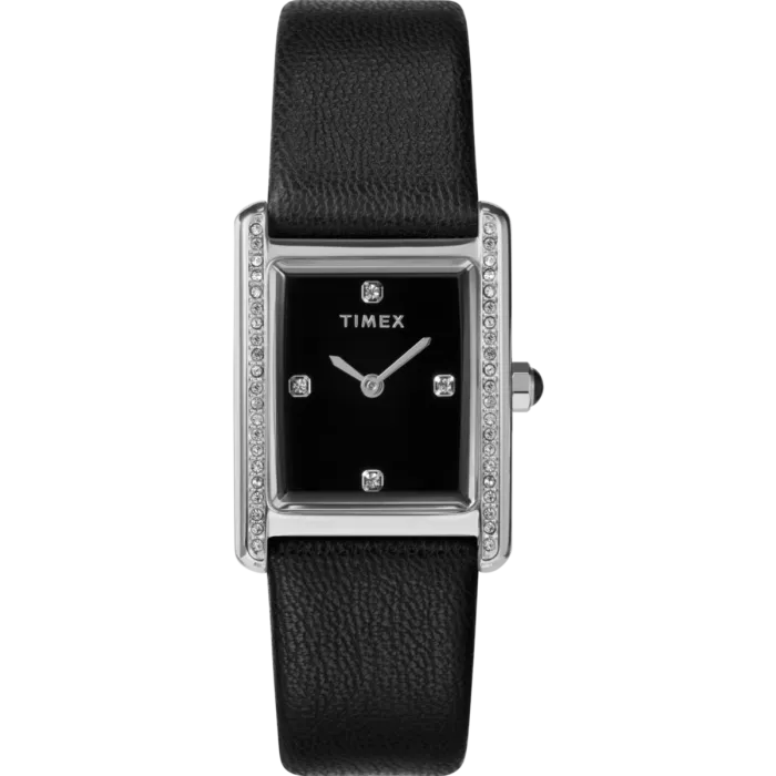 Introducing the stylish Timex® Analogue 'Hailey' Women's Watch TW2W63800, a masterpiece designed to complement any woman's elegance. With a delicate rectangular brass case that gleams with a vibrant silver finish, this watch speaks sophistication and charm. The dimensions are thoughtfully crafted; at just 24mm in diameter and 9mm thick, it sits lightly on the wrist, providing utmost comfort without compromising on style. It features a stunning black dial, protected by mineral glass, which not only enhances its visual appeal but also offers durability for everyday wear. This timepiece showcases intricate stone settings on the bezel, adding a touch of glamour that captures the light beautifully as you move. The watch is powered by a reliable quartz movement, ensuring precision in timekeeping that busy women can depend on. Its sleek black leather band, measuring 19cm in length and 17mm in width, not only contrasts perfectly with the black dial but provides a comfortable fit with a classic buckle clasp. This watch also boasts a water resistance of 5 bars, allowing you to wear it with confidence during your daily activities. The Timex® Analogue 'Hailey' is more than just a watch; it's an expression of femininity and grace, making it a timeless addition to any jewelry collection. Whether dressing up for a special occasion or accessorizing a casual outfit, this watch is an essential piece.