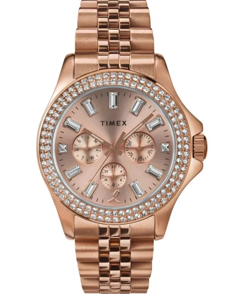 Adorn your wrist with the elegance of the Timex Multi Dial 'Kaia X Bcrf' Women's Watch TW2V96700. This exquisite timepiece effortlessly combines functionality with style. The stunning rose gold case, measuring 40mm in diameter and crafted from durable stainless steel, showcases a perfectly round design that complements any outfit. With a thickness of just 11mm and a thoughtful lug height of 49mm, this watch feels as good as it looks on your wrist. The mineral glass dial window reveals a beautifully designed rose gold dial, which features a multi-dial display that not only tells time but also provides a day-date function for added practicality. \n\nThe attention to detail extends to the watch's bezel, adorned with sparkling stone settings that elevate its sophistication. The rose gold-toned stainless steel band, measuring 19cm in length and 19mm in width, ensures a comfortable fit, securely held by a fold-over clasp with a push-button feature. Not only is this watch majestic in appearance, but it also has an impressive water resistance of 5 bars, making it suitable for everyday wear without compromising on style. Whether you're dressing up for an elegant evening or adding a touch of glam to your casual look, the Timex Multi Dial 'Kaia X Bcrf' is the perfect accessory that embodies femininity and grace.