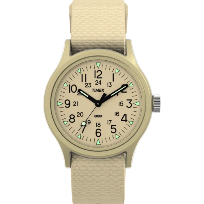 Timex® Analogue 'Mk1' Men's Watch TW2Y19800 is a symbol of timeless design and functionality crafted for the modern man. This watch exemplifies a classic military aesthetic combined with advanced quartz movement, ensuring precision and reliability in every tick. The round case, constructed from durable beige resin, measures 36mm in diameter and features a thickness of 12.5mm, making it both lightweight and comfortable for everyday wear. With its clean beige dial and sturdy mineral glass that protects against scratches, it embodies the spirit of adventure and resilience. The beige fabric strap is not just comfortable but also sturdy, measuring 21cm in length and 18mm in width. Fastened with a reliable buckle clasp, it guarantees an adjustable fit for various wrist sizes, ensuring it stays firmly in place whether you’re at the office or on a weekend hike. This model is designed to be water-resistant up to 3 bars, making it perfect for those unexpected splashes or daily activities requiring a bit more durability. The Timex® Analogue 'Mk1' is more than just a watch; it’s an accessory that complements a range of styles, from casual to more formal attire. Its understated elegance and robust features make it a versatile piece for all occasions, while the historical inspiration behind its design pays homage to tradition but remains firmly rooted in today’s watchmaking spirit.