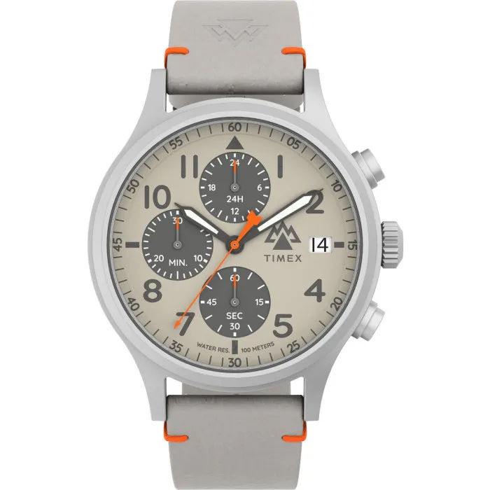 The Timex® Chronograph 'Sierra Chrono' Men's Watch TW2W16500 is a stunning blend of rugged durability and sophisticated style. Designed for the modern man, this military-inspired timepiece features a robust 42mm round case crafted from high-quality brass, ensuring longevity and resilience. The sleek silver case contrasts beautifully with the bold grey dial, which is protected by durable mineral glass, allowing for clear visibility in various lighting conditions. This timepiece not only exudes style but also functionality, equipped with a precise quartz movement that guarantees accurate timekeeping. The chronograph display is both practical and attractive, featuring sub-dials for measuring elapsed time, which is perfect for active lifestyles. Additionally, a date calendar adds to its utility, ensuring you stay organized. Adorning your wrist is a stylish leather band in grey, measuring 19mm in width and 21cm in length, secured with a reliable buckle clasp. This complementary band enhances the watch's military aesthetic while providing comfort throughout the day. The thickness of the case is a manageable 11mm, resting lightly on the wrist while still making a statement. With an impressive water resistance of 10 bars, this watch is suitable for various water activities, adding to its versatility. Weighing in at 72 grams, the Timex® Chronograph 'Sierra Chrono' effortlessly combines function and engineering into a powerful accessory, making it the perfect companion for any adventure.