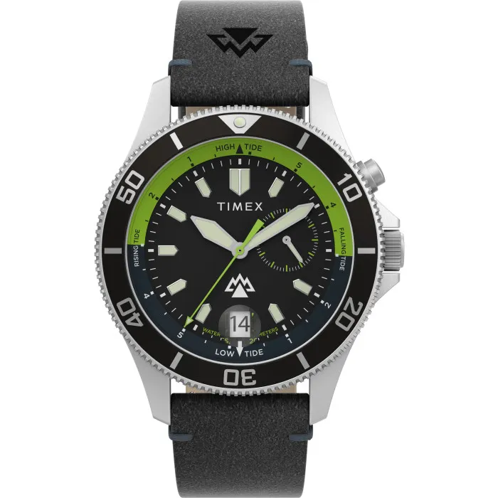 The Timex® Analogue 'Sierra' Men's Watch TW2W21900 is a quintessential accessory that balances ruggedness with sophistication. This timepiece embodies the spirit of adventure, drawing inspiration from military precision and functionality. Crafted with a high-quality stainless steel case, it features a striking 41mm diameter that offers a robust look without being too bulky. The round case, with a thickness of 13mm, is designed to withstand the challenges of daily wear while offering a subtle gleam from its silver shading. Its black dial, protected by durable mineral glass, presents luminous hands and numbers, ensuring readability even in low-light conditions. Equipped with a turnable bezel and a reliable quartz movement, this watch is as much about timing as it is about style. The additional tide tracker caters to adventurers and nautical enthusiasts alike, providing practical information at a glance. The watch is anchored by a sturdy black leather band, measuring 19mm in width and 21cm in length, secured with a classic buckle clasp that promotes comfort and stability on your wrist. The integrated date calendar enhances its utility, making it an essential companion for work, play, or travel. With a water resistance of up to 20 ATM, it's perfectly suited for those who venture into various environments. With a weight of just 90g, the Timex® Sierra is lightweight enough for everyday use yet durable enough to keep up with your lifestyle. This watch truly exemplifies a seamless fusion of form and function, making it a must-have for every modern man.