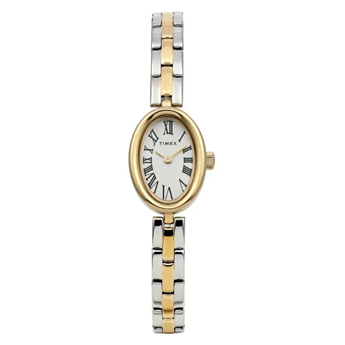 Timex® Analogue 'Trend Cavatina Main Line' Women's Watch TW2Y26800 epitomizes sophistication and versatility, making it a quintessential accessory for the modern woman. With a stunning oval case crafted from premium stainless steel, this timepiece boasts a lustrous gold hue that captures the light beautifully. Measuring 19mm in diameter, it is elegantly proportioned, complementing both formal and casual attire effortlessly. The watch is designed with a striking white dial, protected by durable mineral glass, allowing for excellent visibility of the time, which is presented through an analogue display.