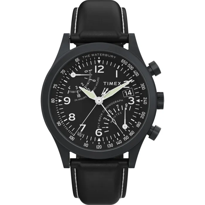 Introducing the Timex® Chronograph 'Waterbury Traditional Fly Back' Men's Watch TW2W48000, a stunning representation of craftsmanship and style. Timex, a stalwart in the watch-making realm since 1854, offers a legacy of quality and innovation. This brand encompasses the spirit of adventure and reliability, ensuring that every piece passes the test of time both in function and form. With roots in America, Timex has consistently delivered timepieces that blend contemporary aesthetics with classic designs. The Waterbury series honors the brand's heritage while catering to modern tastes, celebrating an enduring connection to both its history and customers. Every watch tells a story, and this model encapsulates a rich narrative that you'll want to be part of. The Waterbury Traditional Fly Back is designed for the man who appreciates the finer details. With its striking 43mm round stainless steel case finished in a sophisticated black hue, this timepiece exudes a rugged elegance. The watch features a bold black dial protected by mineral glass, elevating its clear readability even in challenging conditions. The chronograph display allows you to time events with precision, while the integrated date calendar ensures that you never miss a moment. A standout feature is the luxurious black leather band, providing not only style but also comfort. Measuring 21mm in width, it features a robust buckle clasp, ensuring a secure fit on your wrist as you embark on daily adventures. With a water resistance of up to 10 bars, the Waterbury Traditional Fly Back is as resilient as it is stylish, making it perfect for both casual outings and more formal occasions. Weighing just 72 grams, this watch feels substantial without being cumbersome. Embrace the blend of heritage and modernity with this exceptional timepiece that is truly versatile, embodying the essence of the Timex brand. Shop Timex TW2W48000 at Ormoda