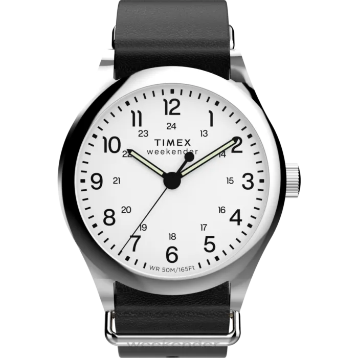 The Timex® Analogue 'Weekender New England' Men's Watch TW2Y35900 embodies a sophisticated blend of style and functionality. Designed for the modern man who appreciates both elegance and practicality, this watch showcases a pristine white dial that contrasts sharply with a sturdy black leather band. The 39mm round stainless steel case is not only appealing but also durable, ensuring that it stands the test of time. At just 8mm thick, it fits comfortably on the wrist, making it an ideal companion for any occasion, from casual outings to formal events. Equipped with quartz movement, this timepiece provides precision and reliability, maintaining accurate timekeeping effortlessly. The mineral glass window protects the dial, enhancing its longevity while maintaining a crystal-clear view. With a water resistance rating of 5 bars, the Weekender New England is suitable for everyday wear, reassuring that splashes and brief immersions won't compromise its integrity. Crafted with a buckle clasp, the black leather band not only ensures a secure fit but also adds a touch of understated luxury to your attire. Whether you are dressing up for a business meeting or enjoying a weekend adventure, this watch pairs perfectly with your wardrobe, enhancing your overall style. With a lug-to-lug height of 46mm, it rests elegantly on your wrist, making it a timeless addition to any watch collection. Every detail is thoughtfully designed to cater to the tastes of men who value sophistication and quality, making this watch an essential accessory for a discerning gentleman. Shop Timex TW2Y35900 at Ormoda