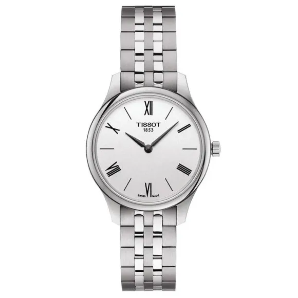 Introducing the Tissot® Analogue '5.5 Lady' Women's Watch T0632091103800, a stunning embodiment of elegance and sophistication. This watch is designed specifically for the discerning woman who appreciates the finer things in life. The refined round case is crafted from high-quality stainless steel, showcasing a timeless silver tone. Measuring just 31mm in diameter and with a delicate thickness of 5.5mm, it exudes femininity and grace. The luxurious sapphire glass dial window ensures clarity and durability, providing the perfect backdrop for the elegant silver dial that seamlessly complements the design. The Tissot 5.5 Lady is not just a watch; it is a statement piece that pairs perfectly with any dress, making it an ideal companion for both daytime and evening events. The watch features a finely crafted stainless steel band that extends to 19cm in length and 14mm in width, ensuring a comfortable fit on the wrist. Its deployment clasp guarantees security while adding an element of sophistication to the overall aesthetic. With a water resistance of 3 bars, this timepiece offers practicality without compromising on style. Designed for those who seek a blend of classic charm and modern luxury, the Tissot 5.5 Lady is powered by a reliable quartz movement, promising accuracy and longevity. At a weight of just 66 grams, it remains lightweight and easy to wear throughout the day. This exquisite watch serves as a testament to Tissot's dedication to quality and craftsmanship, making it an essential addition to any elegant woman's collection.