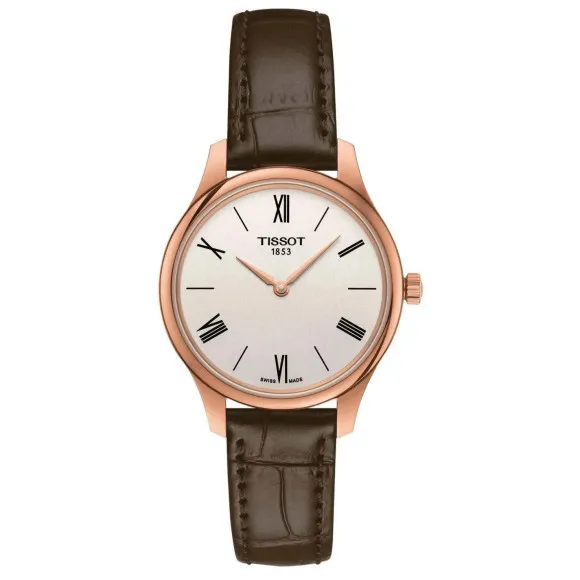 Introducing the Tissot® Analogue '5.5 Lady' Women's Watch T0632093603800, a stunningly elegant piece, perfect for contemporary women who appreciate the beauty of classic design. The brand Tissot is synonymous with tradition, quality, and prestige, crafting exquisite timepieces since 1853. Known for pushing the boundaries of horological excellence, Tissot combines Swiss watchmaking heritage with innovative technology and style. Each watch is a testament to the brand's commitment to precision and elegance, serving as an emblem of sophistication. The Tissot philosophy is encapsulated in the way they fuse functionality with aesthetics, making each watch not just a timekeeper but also a perfect accessory for any outfit.  The Tissot® Analogue '5.5 Lady' is a chic dress watch that will undoubtedly elevate your style. With a case crafted from high-quality stainless steel, this watch boasts a sophisticated rose gold finish that adds a touch of luxury. The round dial, elegantly adorned in a pristine white hue, is protected by sapphire glass, ensuring a clear view of the time while resisting scratches. Measuring 31mm in diameter, the case is delicately slim at just 5.5mm thick, making it a comfortable wear for all-day elegance. The watch is powered by a reliable quartz movement, ensuring accuracy in every tick. The brown leather band measures 19cm in length and 14mm in width, featuring a deployment clasp that guarantees a secure and personalized fit. Resilient to water up to 3 bars, it presents a practical choice for daily wear without compromising on style. The watch's lug-to-lug height of 37mm provides a balanced and flattering fit on the wrist, making it well-suited for both formal and casual occasions. Whether you’re dressing for a business meeting or a night out, this timepiece complements your look with grace and charm. Shop Tissot T0632093603800 at Ormoda