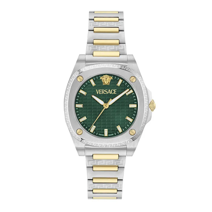 Discover a dazzling timepiece crafted for the modern woman. The Versace Analogue 'Greca Pulse' Women's Watch VE5H00426 epitomizes elegance and sophistication, making it a perfect addition to any wardrobe. Its stunning green dial is not just eye-catching; it adds a refreshing burst of color to classic styling while perfectly coordinating with the intricate details of the brand's design philosophy. Designed with a round stainless steel case that flows effortlessly, this watch features a 35.8mm diameter, and its 9mm thickness gives it a sleek profile suitable for any occasion, be it a casual outing or a formal event. This exquisite watch is more than just a fashion statement; it boasts a reliable quartz movement, ensuring precision with every tick. The sapphire glass dial window protects it from scratches and ensures longevity, keeping your timepiece looking pristine. The multicolored stainless steel band, extending to 19cm, is not only comfortable on the wrist but also stylishly versatile, with an 18mm width that complements the overall design. A deployment clasp securely fastens the watch, making it easy to wear and remove. Whether you're treating yourself or gifting it to a special someone, this watch transcends time with its thoughtful design elements and superior quality. With a water resistance of up to 5 bars, the Versace Analogue 'Greca Pulse' is perfect for everyday wear, combining practicality with luxury effortlessly. Make every moment count with this stunning piece, embodying the spirit of femininity and grace.Shop Versace VE5H00426 at Ormoda
