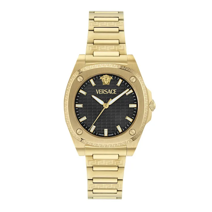 Step into elegance with the Versace® Analogue 'Greca Pulse' Women's Watch VE5H00626. This stunning timepiece showcases a beautiful round gold case that brings an air of sophistication to any attire. Measuring 35.8mm in diameter and 9mm in thickness, this watch combines delicate aesthetics with practical design. The gleaming black dial is protected by durable sapphire glass, ensuring clarity and resistance against scratches. As you gaze at the time, you will appreciate the precision of the quartz movement, which guarantees accurate timekeeping for your busy lifestyle. Crafted from stainless steel, both the case and the elegant gold band exude luxury and durability. The watch band measures 19cm in length and 18mm in width, offering a comfortable fit around your wrist. The deployment clasp ensures ease of wear while also adding a touch of finesse. Built to withstand everyday challenges, this watch has a water resistance of up to 5 bars, making it suitable for various occasions, from poolside parties to elegant dinners. The Versace 'Greca Pulse' blends fashion and functionality. It's not just a watch; it's a statement piece that encapsulates the essence of modern femininity. Adorn your wrist with this exquisite timepiece and let it reflect your style and sophistication. Combining luxurious materials with Versace’s iconic design symbolism, this watch is perfect for women who embrace their individuality and appreciate quality craftsmanship. Whether it's a gift for yourself or a loved one, it’s a timeless addition to any jewelry collection.Shop Versace VE5H00626 at Ormoda