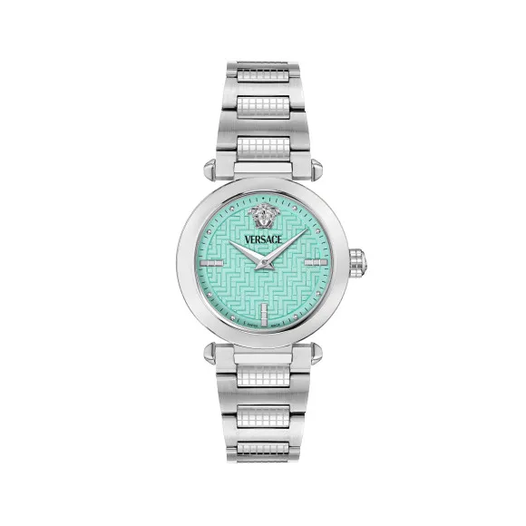 Indulge in the elegance of the Versace® Analogue 'Greek' Women's Watch VE5B00225. This luxurious timepiece is a true masterpiece crafted for the modern woman who appreciates finesse and style. The stunning stainless steel case, with a diameter of 34mm and a sleek thickness of 7.95mm, exemplifies durability while maintaining an air of sophistication. The captivating blue dial, protected by sapphire glass, reflects both boldness and charm, making it a perfect accessory for any occasion. With precision at its core, this watch features a reliable quartz movement, ensuring you’re always on time without compromising on style. The round case style further adds a classic touch, elevating its allure. A deployment clasp secures the watch comfortably to your wrist, and the 19cm stainless steel band, with a width of 19mm, is designed for both comfort and a perfect fit. Water-resistant up to 5 bars, the Versace Analogue 'Greek' watch is not only a stunning accessory but also practical enough to withstand daily life. Weighing just 111 grams, it offers a light yet luxurious feel, ensuring you can wear it all day with ease. A piece that showcases sophistication and style, it embodies the timeless glamour that Versace is renowned for, making it an essential addition to any jewelry collection. Shop Versace VE5B00225 at Ormoda