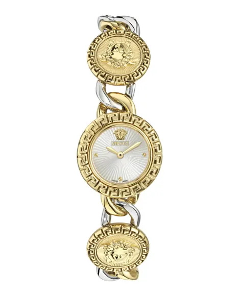 Introducing the stunning Versace® Analogue 'La Greca Stud Icon' Women's Watch VE0Q00325, a personal expression of elegance that perfectly marries style and functionality. This exquisite timepiece from the iconic Italian brand Versace, known for its luxurious aesthetic and high-fashion appeal, is designed for the modern woman who appreciates not just the art of timekeeping but also the artistry behind each creation. Versace stands as a symbol of confidence and empowerment, encapsulating the essence of femininity through daring designs and impeccable craftsmanship. Each watch is a testament to the brand's commitment to excellence, where every detail is carefully considered to create a piece that is not only a functional accessory but also a statement of style and sophistication. The Versace® Analogue 'La Greca Stud Icon' Women's Watch combines a lustrous gold stainless steel case with a shimmering silver dial, elegantly framed in a 28mm round case that enhances its feminine allure. The quartz movement guarantees precision while the sapphire glass dial window assures durability and resistance against scratches. With a case thickness of just 8mm, this watch seamlessly compliments the wrist, and together with a vibrant multicolour band made of stainless steel, it adds a playful yet chic touch, perfect for both casual and formal occasions. The band stretches 19cm in length and features a practical folding clasp, ensuring a comfortable and secure fit. Boasting a water resistance of 3 bars, this watch can withstand splashes and brief encounters with water, making it ideal for daily wear. The luxurious appeal and striking design of this timepiece make it a must-have accessory for any woman looking to elevate her collection. Wear it to showcase your stylish personality or gift it to a loved one, and relish in the beauty it brings to any outfit. Shop Versace VE0Q00325 at Ormoda