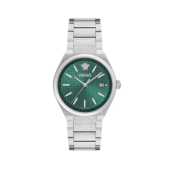 The Versace® Analogue 'V-auria' Men's Watch VE0F00125 juxtaposes modern luxury with a timeless aesthetic. Crafted for the discerning man, this watch boasts a precision quartz movement, ensuring that time is kept with impeccable accuracy. The round case, made from durable stainless steel, measures 38mm in diameter. Its elegant silver tone complements the rich green dial, which is perfectly protected by a scratch-resistant sapphire glass window. The sophistication of this watch lies not just in its looks but also in its functionality; it features a date calendar, providing both practical and stylish elements for daily wear. The design is further enhanced by the stainless steel band, which not only assures durability but also offers a comfortable fit with its deployment clasp. With a length of 21cm and a width of 21mm, the band aligns perfectly with the refined aesthetics of the watch. The timepiece is rated at an impressive 5 bars of water resistance, making it ideal for those who lead an active lifestyle while still maintaining a sense of elegance. Weighing in at 138 grams, it strikes a perfect balance between being lightweight and substantial, ensuring that it sits flawlessly on the wrist. The Versace V-auria is not merely a timekeeping device; it is a statement of style and sophistication, tailored explicitly for the modern man with a taste for luxury.