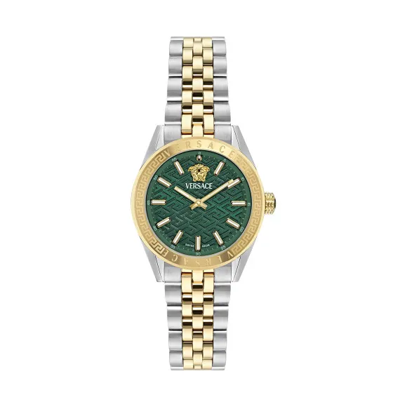 Introducing the stunning Versace® Analogue 'V-code' Women's Watch VE8I00424, a true masterpiece that captures the essence of luxury and sophistication. This elegant dress watch seamlessly blends contemporary design with timeless aesthetics, making it the perfect accessory for any occasion. Crafted with meticulous attention to detail, this watch embodies the unmatched elegance that Versace is renowned for. With a rich history in haute couture, Versace transcends the world of fashion and brings that same level of artistry and luxury to their timepieces. This watch showcases not just a method of telling time, but a statement of style, empowering women everywhere to express their individuality through graceful elegance.  The eye-catching design of the V-code watch features a stunning green dial that beautifully contrasts with the radiant gold case, radiating an aura of opulence. The stainless steel construction ensures durability while maintaining a light and comfortable fit for daily wear. Measuring at a diameter of 36mm and a thickness of just 8mm, it strikes the perfect balance between boldness and femininity. The sapphire glass protects the delicate dial from scratches and enhances clarity, ensuring that you always look your best. The multicolour stainless steel band, measuring 19cm in length and 17mm in width, comes with a secure deployment clasp for added assurance. With an impressive water resistance of 5 bars, this timepiece is not only about aesthetics; it offers practicality as well.  Whether dressed up for a formal event or accessorized with casual attire, the Versace® Analogue 'V-code' Women's Watch VE8I00424 is more than just a watch—it's a statement of exquisite taste and a celebration of femininity. Shop Versace VE8I00424 at Ormoda