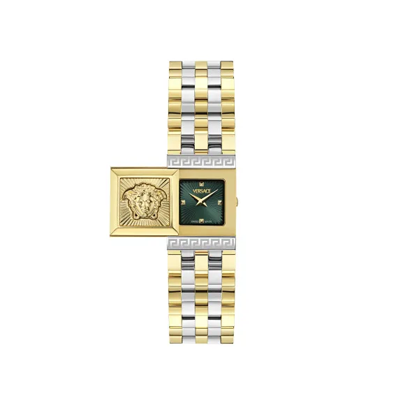 Versace® Analogue 'Versace Reveal' Women's Watch VE0C00125 is a stunning timepiece that represents the essence of luxury and sophistication. Crafted with precision, this exquisite watch features a rectangular stainless steel case, measuring 25mm in length, 18mm in width, and a sleek 8.4mm thickness. The luxurious gold finish enhances the elegant aesthetic, making it a perfect accessory for any occasion. The eye-catching green dial, protected by sapphire glass, adds a unique flair to the watch. The analogue display elegantly complements the overall design, allowing you to easily keep track of time with style. Designed for the modern woman, the Versace Reveal captures the bold and confident spirit of its wearer while emanating a sense of grace. The luxurious multicolour stainless steel band, measuring 19cm in length and 18mm in width, is not only durable, but also fashionable. The deployment clasp ensures a secure yet comfortable fit on the wrist. With a water resistance of up to 3 bars, this timepiece can seamlessly transition from chic events to everyday wear. Weighing in at 85 grams, it is lightweight and easy to wear throughout the day. Whether you are dressing up for an evening gala or enjoying a casual outing, the Versace® Analogue 'Versace Reveal' Women's Watch is the perfect finishing touch to your outfit.