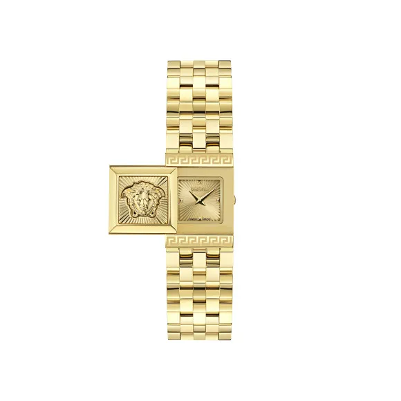Introducing the Versace® Analogue 'Versace Reveal' Women's Watch VE0C00225, a stunning accessory that embodies elegance and sophistication. Designed specifically for the modern woman, this watch features a beautifully crafted rectangular case made of luxurious stainless steel, coated in radiant gold. Measuring 25mm in length and 18mm in width, its delicate size offers a graceful touch to every wrist. The thoughtfully designed 8.4mm thickness further emphasizes its sleek profile, making it a perfect fit for both casual outings and formal occasions. The watch displays its time through an exquisite analogue dial, also colored in gold, which beautifully contrasts against the high-quality sapphire glass window. This exceptional glass not only contributes to the luxurious aesthetic but ensures durability and clarity. The deployment clasp adds a touch of practicality while maintaining the watch's elegant appearance. With a band length of 19cm and width of 18mm, this watch wraps comfortably around your wrist, ensuring a secure fit that feels as good as it looks. Moreover, with a water resistance of up to 3 bars, it is designed for the woman that embraces life's every moment, from a day at the office to an evening gala. Weighing just 85.0 grams, the Versace Reveal allows for effortless wear while making a bold statement. Elevate your accessory collection with this iconic piece that defines luxury, style, and Versace's revered craftsmanship.