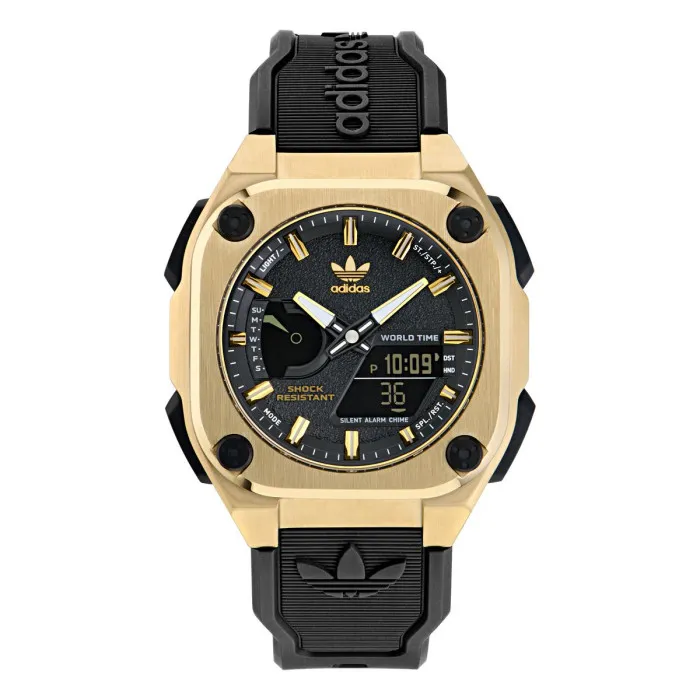 The Adidas Originals® Analogue-digital 'City Tech One Sst' Unisex's Watch AOFH23501 is a masterpiece that unifies style and performance. Designed for the active lifestyle, this sport watch brings together a wealth of functionality with an appealing aesthetic. The blend of analogue and digital displays allows you to read the time swiftly while enjoying the added benefits of modern technology. The striking black dial, shielded by durable mineral glass, complements the gold stainless steel case, making a bold statement without compromising on versatility. Measuring 45mm in diameter and 13mm in thickness, the round case offers a comfortable fit on any wrist, while its 10 bars of water resistance ensures reliability in various environments. The watch features a practical day-date calendar, so you'll never lose track of important events. You can take advantage of the multiple functions it offers, including a stopwatch, countdown timer, world time, and alarm, making this watch a perfect companion for travelers and fitness enthusiasts alike. The black plastic strap not only adds to the comfort with a length of 20cm and width of 20mm but also enhances durability, ready to withstand the rigors of an active lifestyle. Weighing merely 108 grams, this watch feels lightweight yet sturdy, so you can wear it all day without discomfort. The classic buckle clasp ensures a secure fit, adding an extra layer of convenience to everyday wear.Shop Adidas Originals AOFH23501 at Ormoda