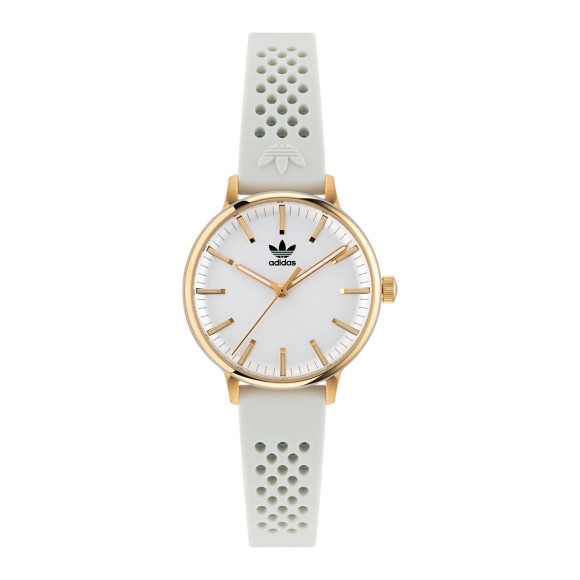 Introducing the Adidas Originals® Analogue 'Code One Xsmall' Women's Watch AOSY23025, a beautiful accessory that brims with elegance and charm. Crafted for women who exude confidence and style, this timepiece embodies the spirit of contemporary chic. The round gold case, measuring just 32mm in diameter, is designed with a sleek, minimalist aesthetic that makes it suitable for any occasion, both casual and sophisticated. The watch boasts a stunning white dial adorned with simple yet sophisticated hour markers, enabling easy readability while maintaining its modern appeal. This exquisite watch features a durable mineral glass window that protects the dial, ensuring clarity and resilience in everyday wear. The watch band, crafted from high-quality silicone in a lovely white hue, offers exceptional comfort and flexibility. With a length of 19cm and a width of 12mm, it fits snugly on the wrist while adding a touch of sporty flair to your outfit. The buckle clasp ensures a secure fit, allowing you to wear it with confidence throughout the day. With a case thickness of just 7.5mm, the Adidas Originals watch is lightweight yet sturdy, making it a perfect option for daily wear. This timepiece is designed to withstand the rigors of life, boasting a water resistance of up to 5 bars. Whether you're running errands, enjoying a day at the park, or going out for dinner, the 'Code One Xsmall' remains a reliable companion. Thanks to its quartz movement, you can trust that timekeeping is precise and hassle-free. Elevate your accessory game with the Adidas Originals watch, a blend of sportiness and elegance that makes it a must-have for any modern woman.Shop Adidas Originals AOSY23025 at Ormoda